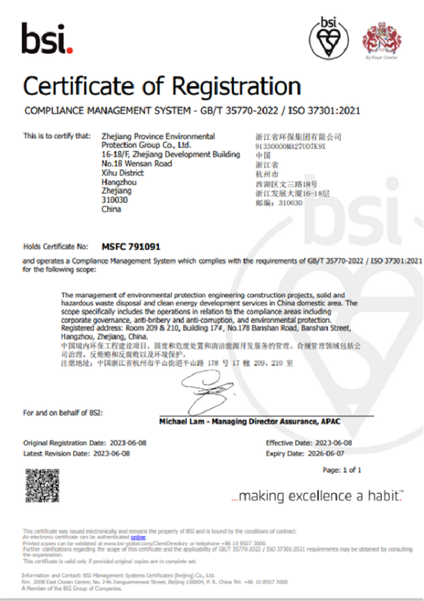喜讯!浙江省环保集团成为国内首个通过ISO 37301合规管理体系认证的环保集团